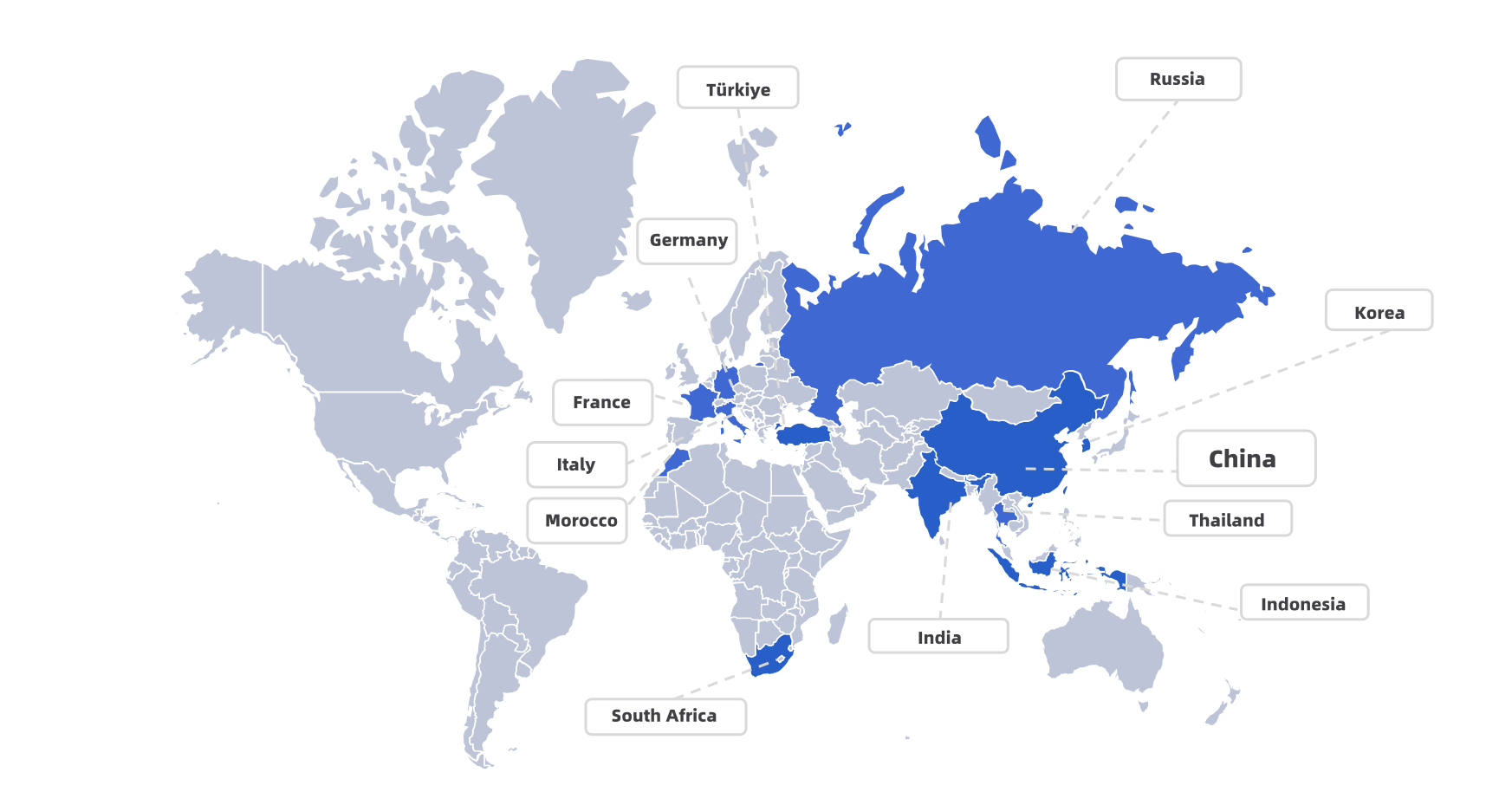 在全球化浪潮中,我们聚焦高潜市场,构建起以韩国、土耳其、印度尼西亚、印度、南非为核心支点的“亚太—中东—非洲”黄金销售走廊。五国均签约独家代理商,并配套设立本地服务中心与专属渠道团队,实现 24 小时响应;通过数字化供应链平台,客户满意度连续三年超过98%。